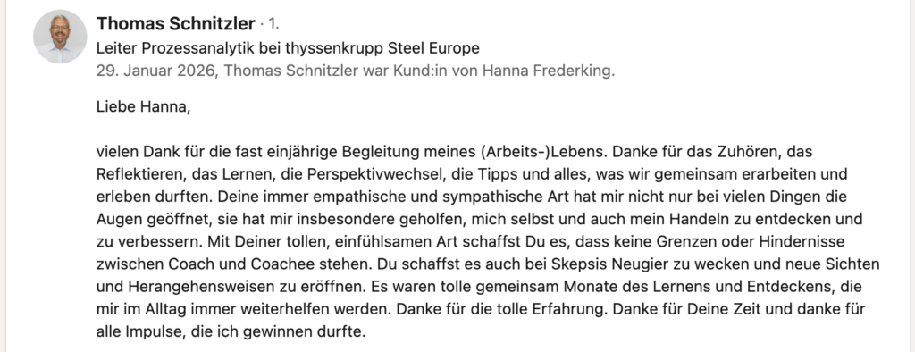 Seit 2019 begleite ich als Coach Führungskräfte, Fachexperten und Teams dabei, wie sie souverän Konflikte lösen und sich gemeinsam erfolgreich weiterentwickeln.