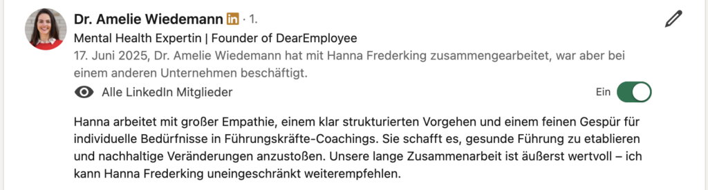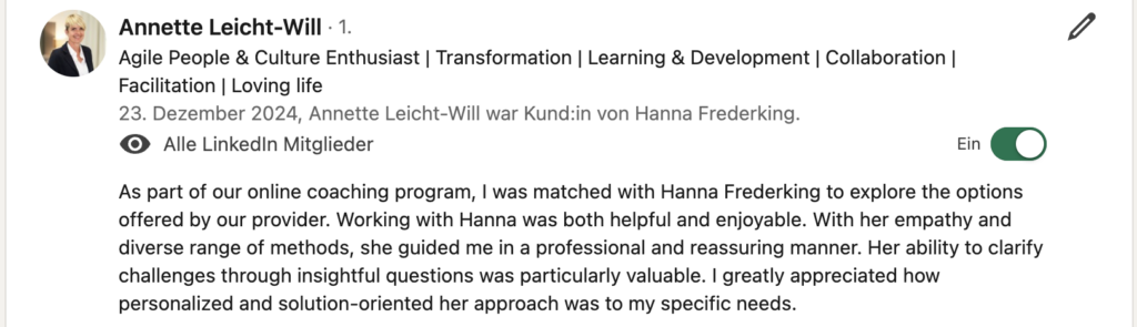 Als Führungskraft bist du häufig mit Veränderungen und Widerständen konfrontiert. Im effizienten 1:1 Leadership Coaching lernst du, souverän Konflikte zu lösen, empathisch Feedback zu geben, dein Team weiterzuentwickeln und dein Wohlbefinden zu steigern.